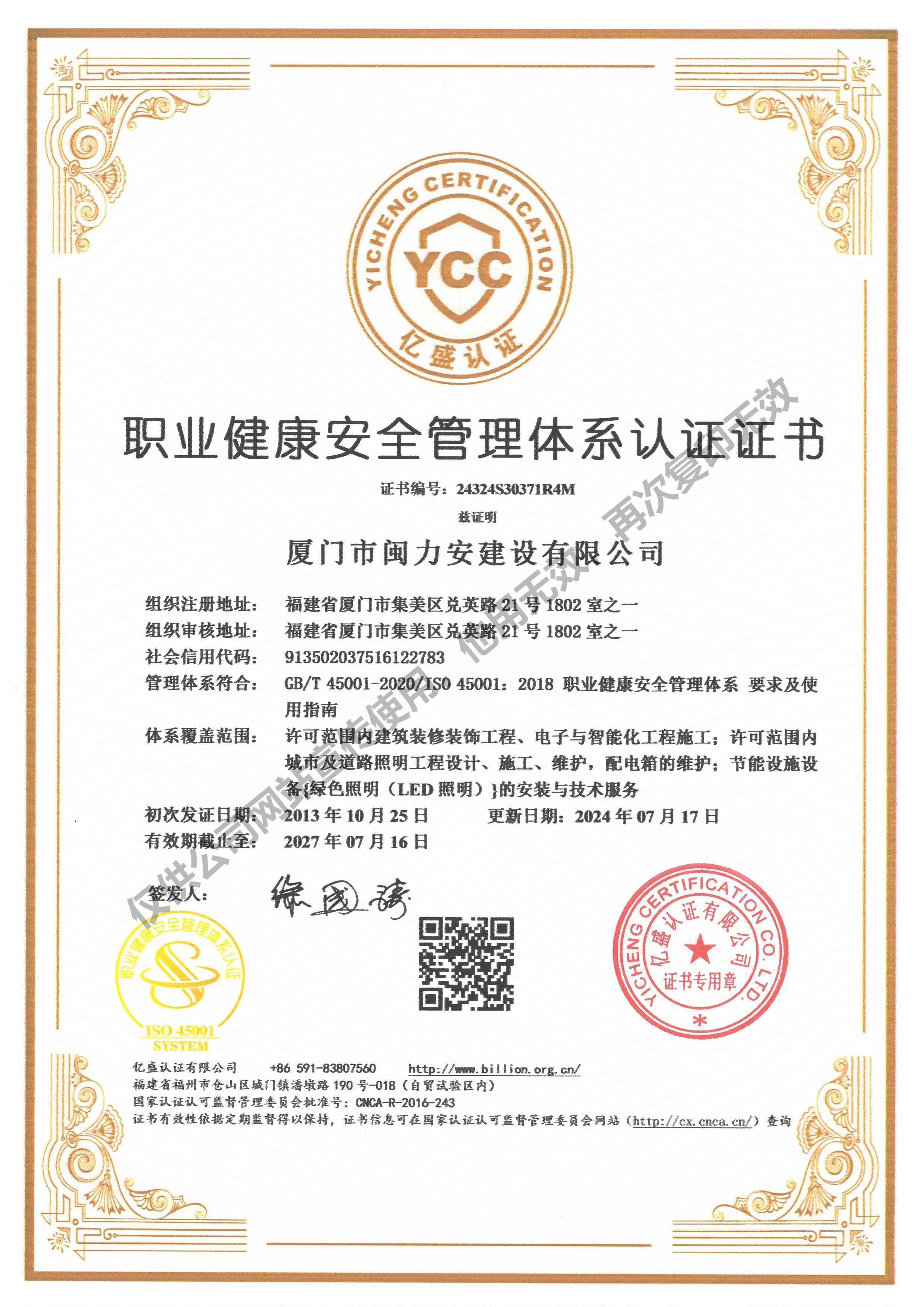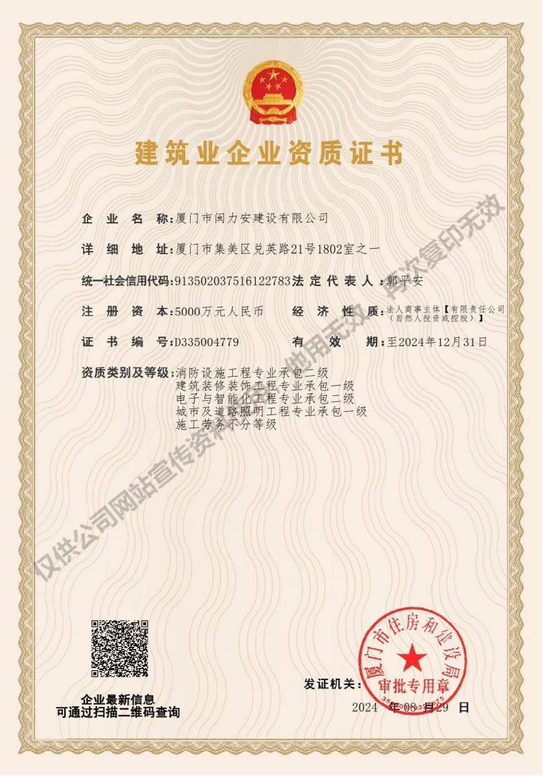 廈門市閩力安建設(shè)有限公司成立于2003年,公司取得市政公用工程施工總承包貳級、建筑裝修裝飾工程專業(yè)承包壹級、城市及道路照明工程專業(yè)承包壹級、電子與智能化工程專業(yè)承包貳級、消防設(shè)施工程專業(yè)承包貳級、電力工程施工總承包叁級、建筑機電安裝工程專業(yè)承包叁級、輸變電工程專業(yè)承包叁級、環(huán)保工程專業(yè)承包叁級、照明工程設(shè)計專項甲級、建筑裝飾工程設(shè)計乙級、施工勞務(wù)等資質(zhì)的綜合型企業(yè),公司于2013年通過了ISO9001質(zhì)量體系認(rèn)證,ISO14001環(huán)境管理體系認(rèn)證,OHSAS18001職業(yè)健康安全管理體系認(rèn)證。